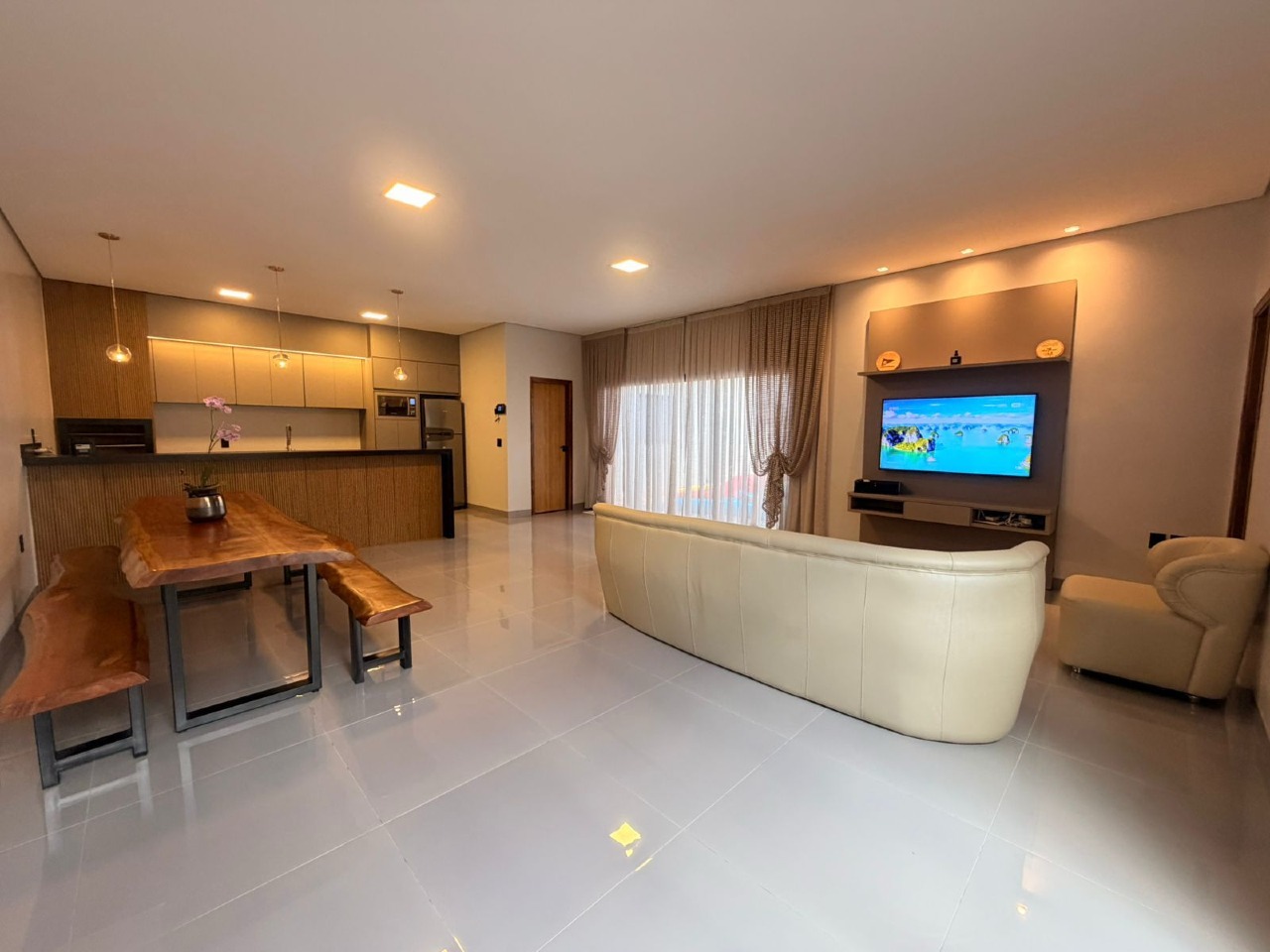 Ampla sala integrada com cozinha e churrasqueira